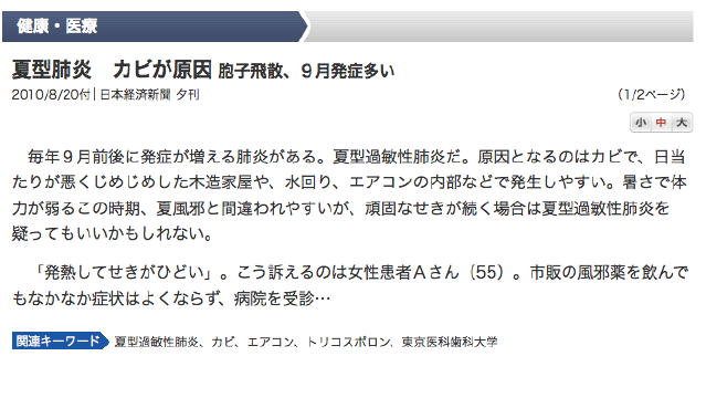 この「夏型過敏性肺炎」とは、カビ菌の一種を何度も吸い込むことによって胞子に対するアレルギー反応が起き、肺に炎症が生じているんですって! エアコンにカビが繁殖しているケースが多いため、5月〜10月の間だけ症状が現れることが多いとか!!!ひ〜っ