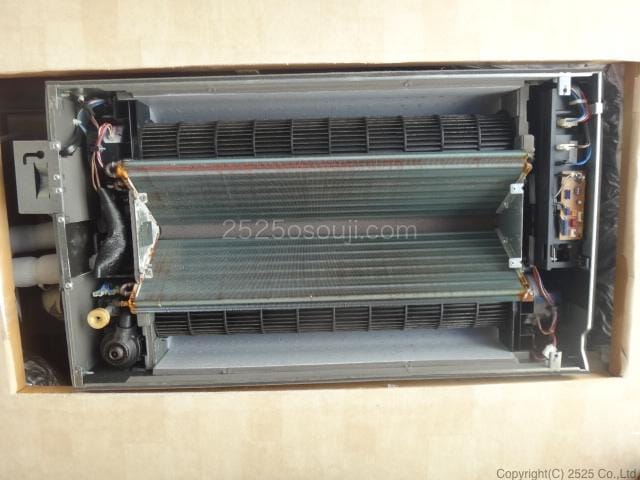 ドレンパンを外した状態です。熱交換器、送風ファンがむき出しになりました。