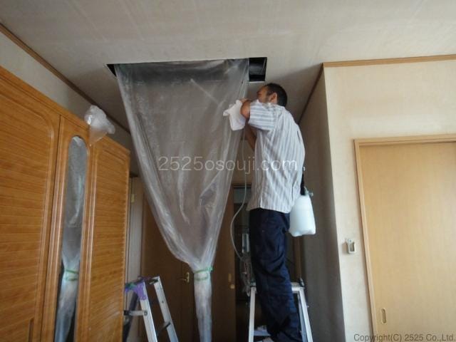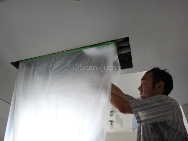 まず天井埋込エアコン周辺の養生をし、脚立やバケツをおき準備をします。
