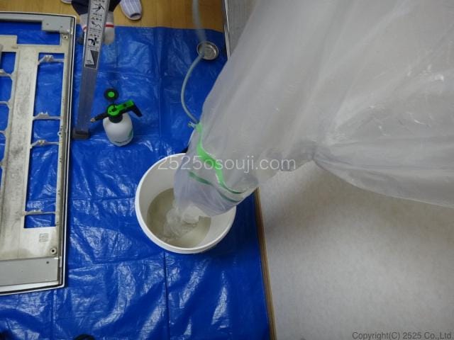 エアコンからカビ・ホコリが流れ落ちてきます。カバーホースをつたってバケツへ溜まっていきます。