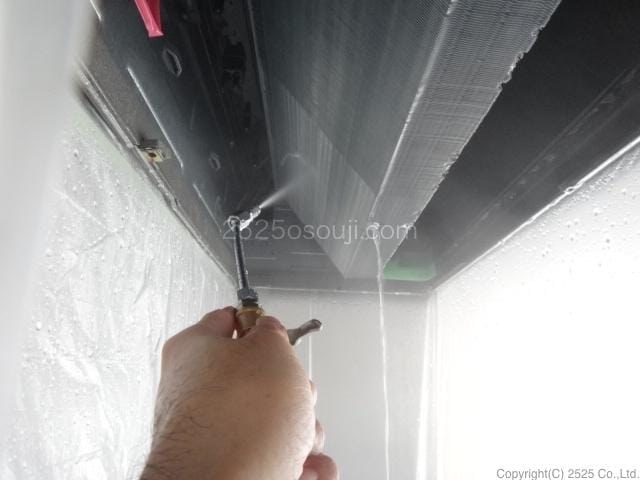 エアコン本体の洗浄(洗浄液の散布、高圧洗浄機でのすすぎ)