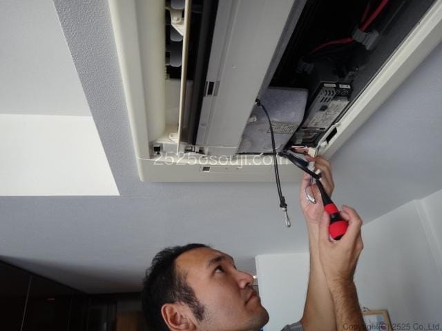 ※1名でも分解可能ではありますが万が一の部品の落下や内部に溜まった水滴を落とさない等店舗、事務所に比べて天井埋込エアコンのある一般住宅は床、家財共にデリケートであるため作業を万全に行うため、当店では2名で施行しております。
