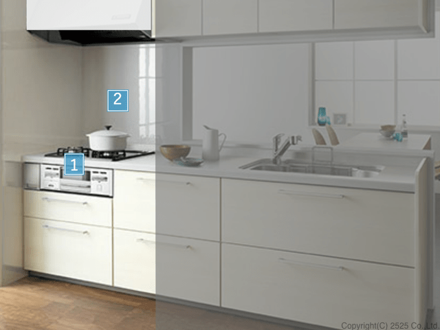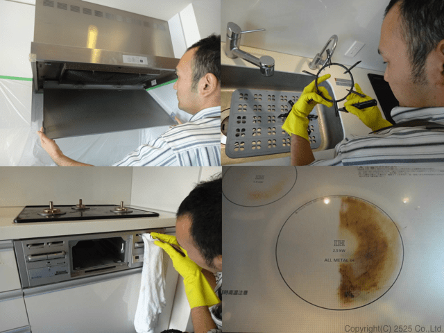 キッチンクリーニングの範囲の一部分、コンロ周りが範囲となります。 作業詳細はキッチンクリーニングページのコンロ周り項目を参照下さい。